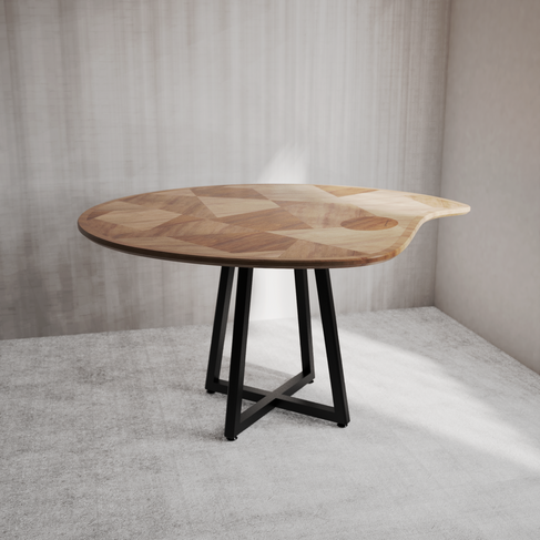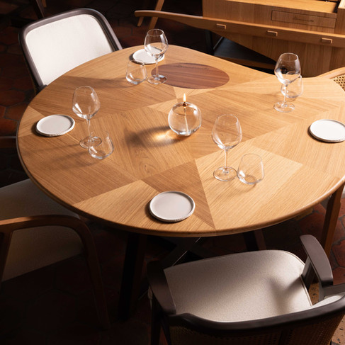 Un ensemble de tables uniques réalisées en marqueterie dont les fils du bois dessinent des formes géométriques et se rejoignent parfaitement pour former une pointe.
